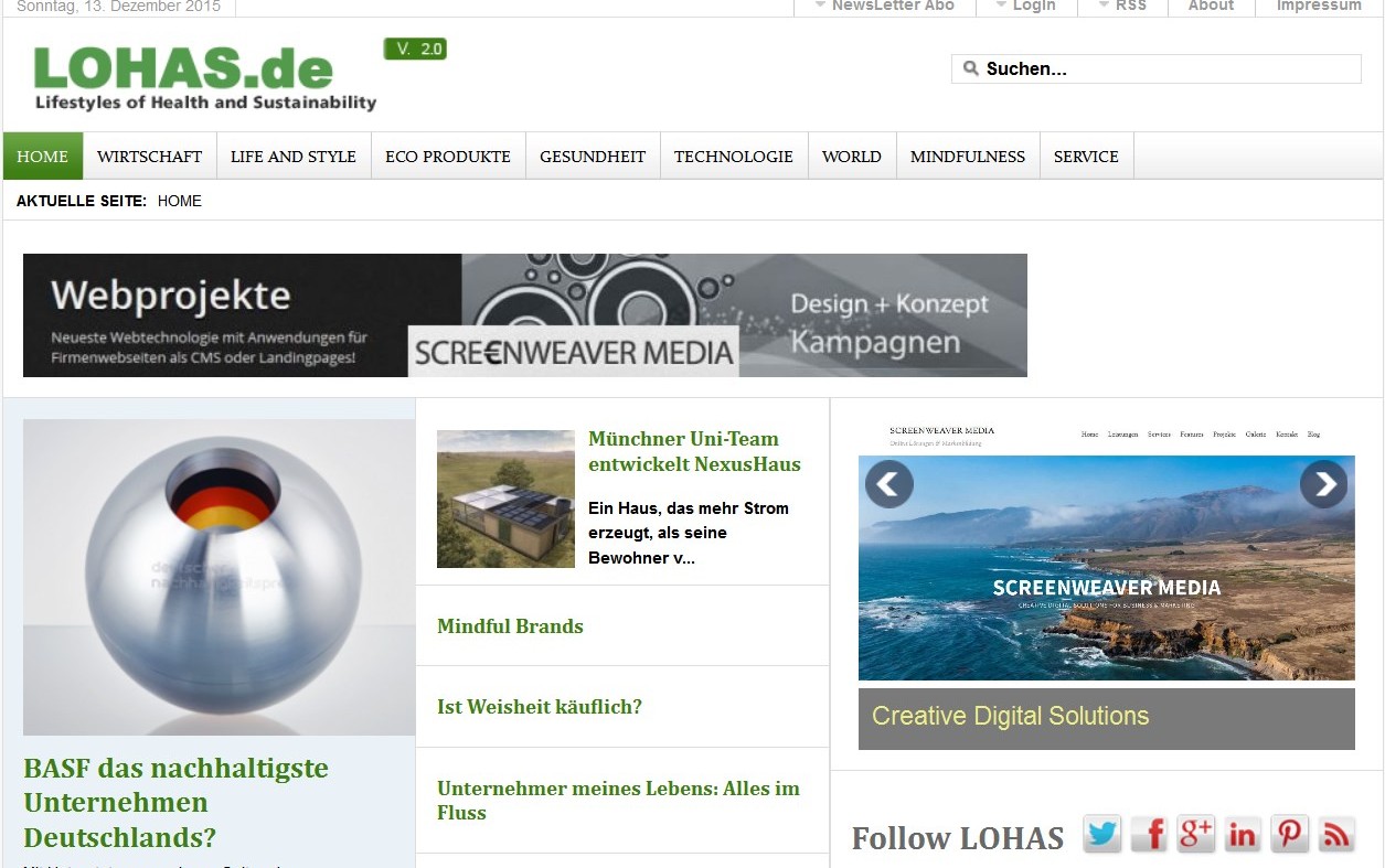 Powered by Screenweaver Lifestyle of Health and Sustainability, kurz LOHAS, bedeutet so viel wie: „Ausrichtung der Lebensweise auf Gesundheit und Nachhaltigkeit“. Neue Werte, neues Bewusstsein, die Bedürfnisse der Menschen richten sich nach innen – eine Umkehr der Lebensweise nach Selbstkenntnis, nach Stressfreiheit und Entschleunigung, Gesundheit, Nachhaltigkeit und Beständigkeit. Dies alles mündet in eine Nachfrage von […]